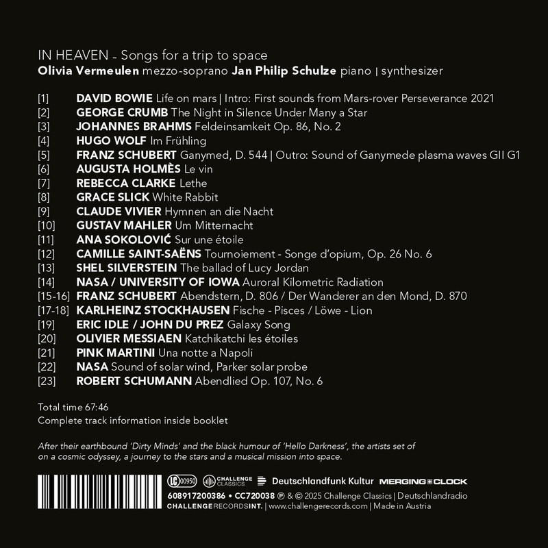 The third collaboration between mezzo-soprano Olivia Vermeulen and Jan Philip Schulze (piano/synthesizer), In Heaven follows their earlier themed albums Dirty Minds and Hello Darkness, albums which were highly rated and won for instance an Edison Award and a Preis der Deutschen Schallplattenkritik. While the first two albums explored earthly themes of eroticism and mortality, this programme turns upward toward the heavens. The concept imagines a cosmic odyssey, blending art song, contemporary music, pop, and psychedelic classics into a voyage through utopian visions, distant planets, and the eternal human fascination with space. Interspersed with NASA sound recordings, the album situates the listener between heaven and earth, fantasy and reality, intoxication and transcendence .