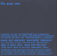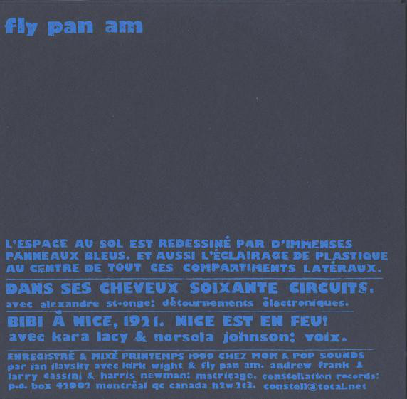 fly pan am playfully explore the tensions between modernist tropes and pop irreverence without succumbing to cloying irony or mock seriousness. the straight-up metronomic drumming, with its obstinate refusal to add flourishes or fills, establishes a foundation upon which bass and guitar lines weave and shift with a naive rigour. the music is sometimes wilfully infuriating in its pursuit of an idea (i.e. track 3, which after a lovely series of harmonic changes, culminates in the repetition of a half-tone interval for over 10 minutes, while the digitalia of local electronic/actuelle musician alex st.onge takes over), and challenges the listener to construct an underlying narrative out of sonic collage (i.e. tracks 2 & 4, each in three parts). tape-based experimentation by all the members of the group add drones, transitional accents, and abrupt interruptions to the live band material.